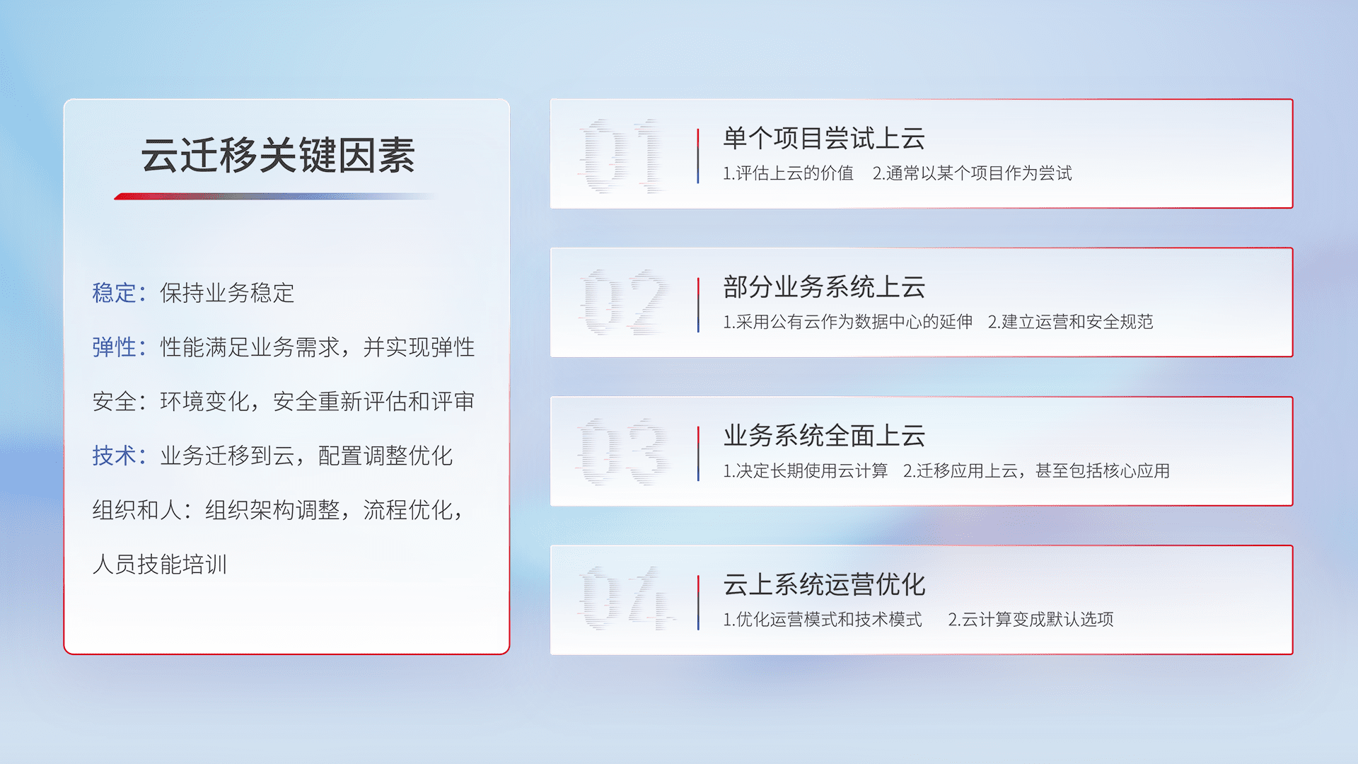 结合实际业务,,从规划设计、、云平台选型、、、云原生改造、、、数据迁移、、、集成交付,,,,迁移全过程为客户识别最佳上云路径,,,,做好风险识别管理,,设计网络架构、、、、身份权限、、、、安全审计合规、、、、操作审计、、日志审计、、、、监控告警策略、、、、多站点容灾设计等,,,,对云上基础设施进行整体规划,,,提升IT治理水平,,,以满足弹性、、高可用、、、高性能的需求。。